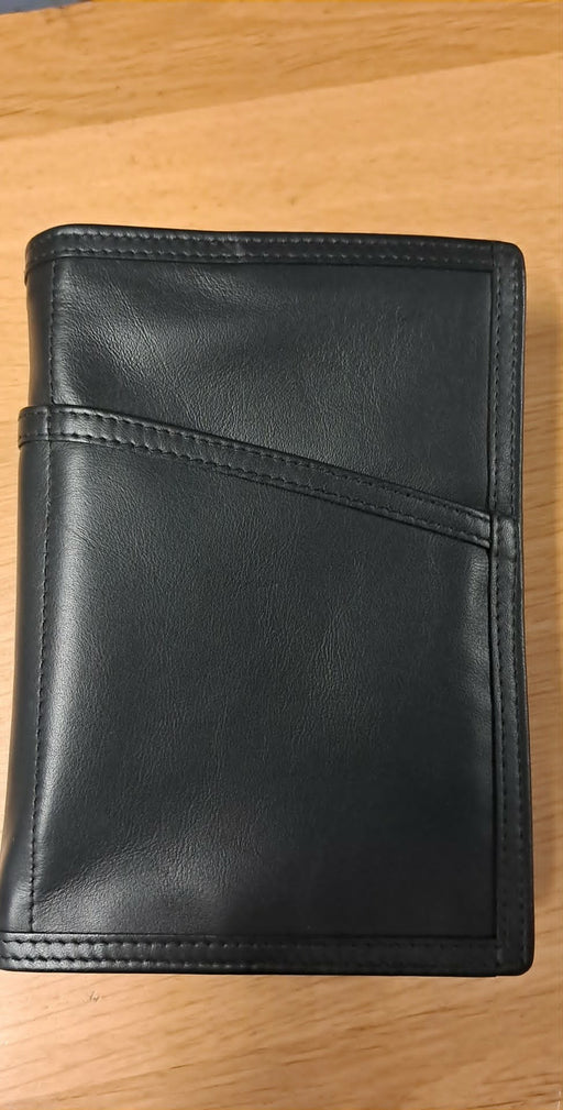 Bíbliuumslag úr svørtum leðri. Passar til størru bíbliuna. Stødd: 15,5 x 22 cm